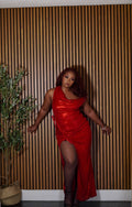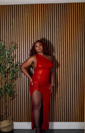 The asymmetric one-shoulder neckline adds modern elegance, while the adjustable side ruching and high slit bring the perfect blend of glamour and confidence. Whether you’re celebrating the holidays, attending a formal event, or stepping into a night of luxury, this gown is designed to make you shine.