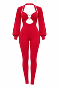 Gold Heart Detail Skinny Jumpsuit & Crop Bolero Set – Red Bodycon Two Piece Outfit